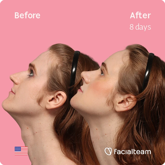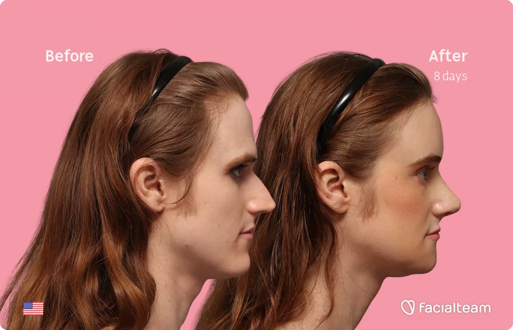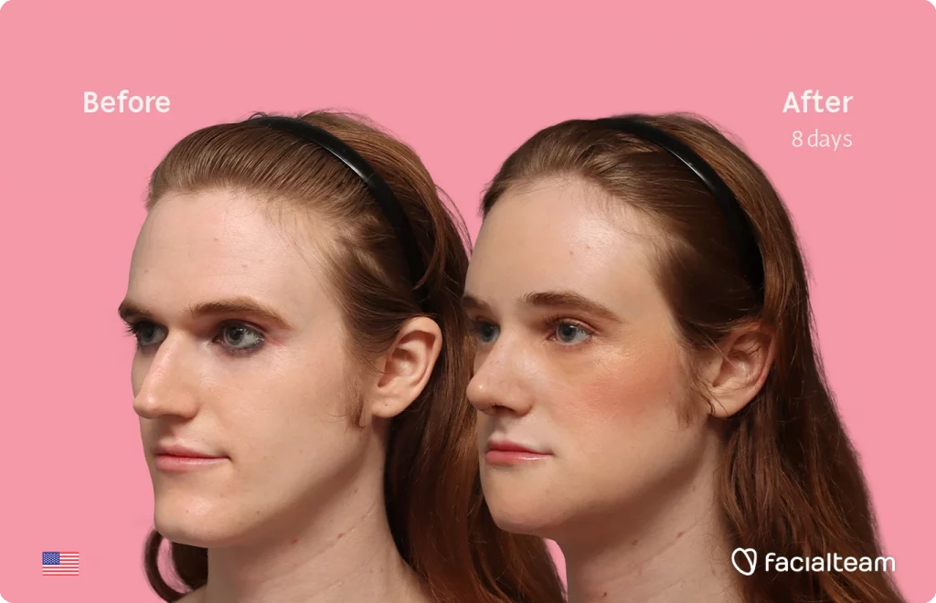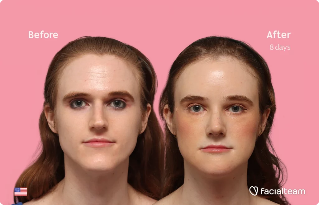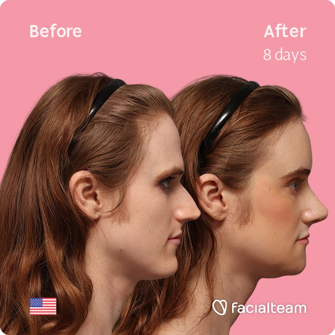 Evy, una mujer estadounidense de 32 años, se sometió a una cirugía de feminización facial en Facialteam, en Marbella. El procedimiento incluyó feminización de la frente, rinoplastia, reducción de la tráquea y remodelación del mentón. Las imágenes del antes y el después, tomadas tan solo ocho días después de la cirugía, capturan la fase inicial de su transformación. Si bien aún presenta algo de inflamación, los resultados iniciales ya sugieren una estructura facial más suave y refinada. El caso de Evy destaca cómo una combinación personalizada de procedimientos de afirmación de género puede comenzar a revelar cambios significativos, incluso en los primeros días de recuperación.